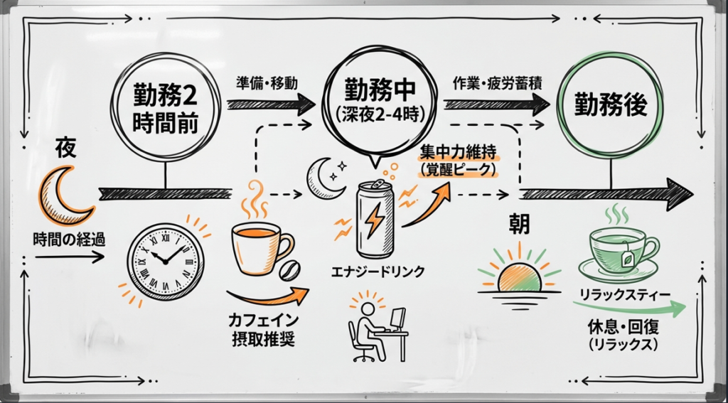 「いつ飲むか」は、「何を飲むか」と同じくらい重要です。ここでは、夜勤の流れに沿って、最適な摂取タイミングを解説します。