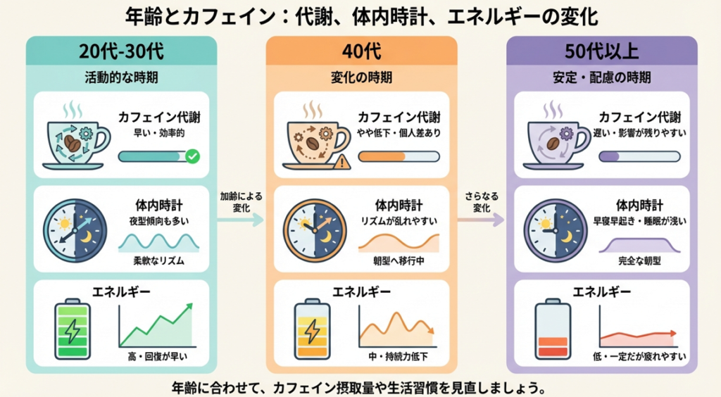 40代は体の変化を実感し始める世代です。特にカフェイン代謝に関しては、大きな転換点となります。
