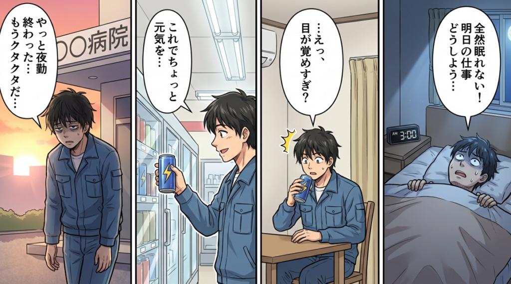 【4コマ漫画】夜勤明けにエナジードリンクを飲んで眠れなくなった失敗談