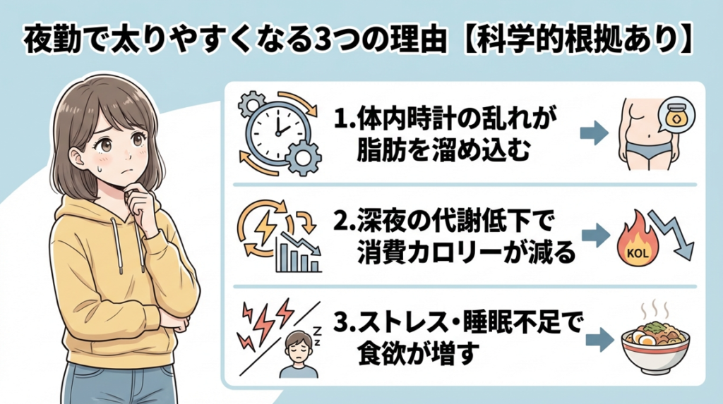 ここでは、夜勤で太りやすくなる3つの科学的理由を解説します。