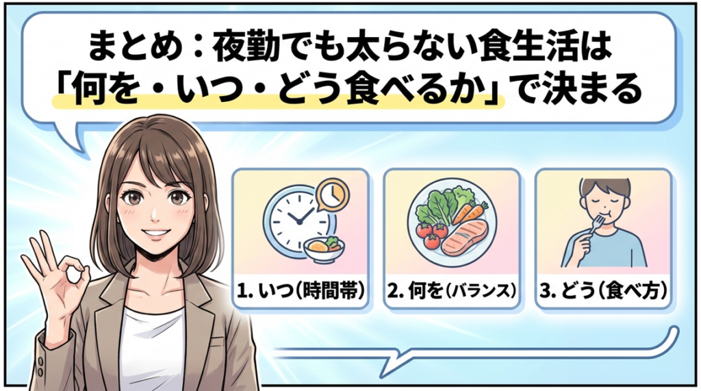 まとめ:夜勤でも太らない食生活は「何を・いつ・どう食べるか」で決まる